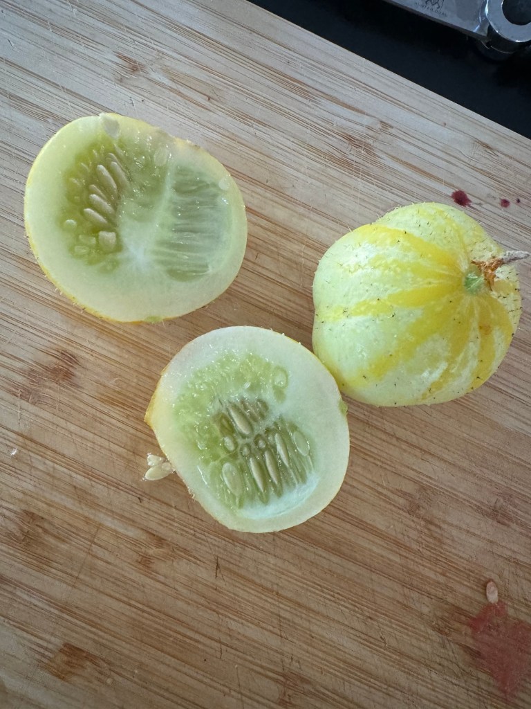 For a while I was wondering if I’d planted zucchini or squash instead ( the rind is quite hard) but no, it takes and smells exactly like a cucumber on the inside. Who knew?
